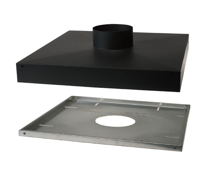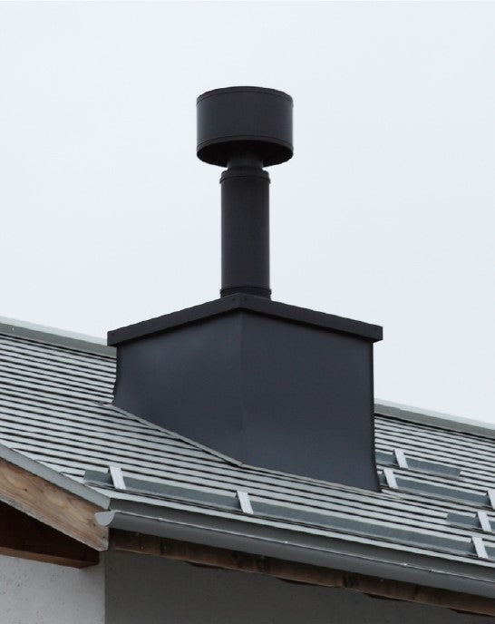 煙突囲いから立ち上がる煙突と丸トップがアクセントとなる人気のある納まりです。煙突囲いが水返しとなり雨仕舞に優れ、煙突の固定もしっかりできます。煙突囲いには、タイル、塗装、板金などお好みのデザインに仕上げることにより、外観の印象も変わります。