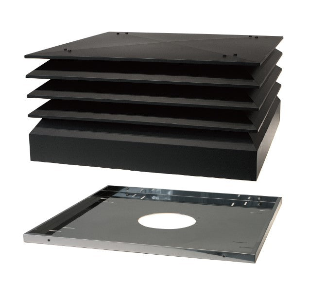 煙突囲いにかぶせるルーバー付きのトップです。内部には防風板、結露防止の断熱材、防鳥網が装備され、風にも雨仕舞にも優れた高性能で見た目にも高級感のあるトップです。天板のみの取り外しが可能で、メンテナンスの作業性もアップします。