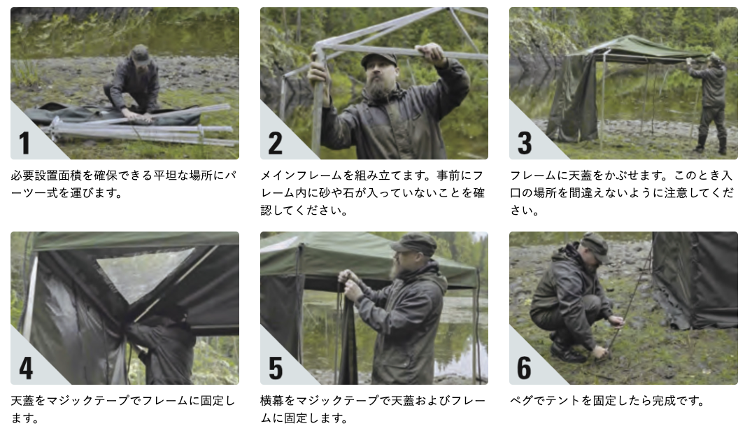 テント設置手順 Hiisi(ヒーシ)の場合。※テントの種類によって多少内容・手順が異なります